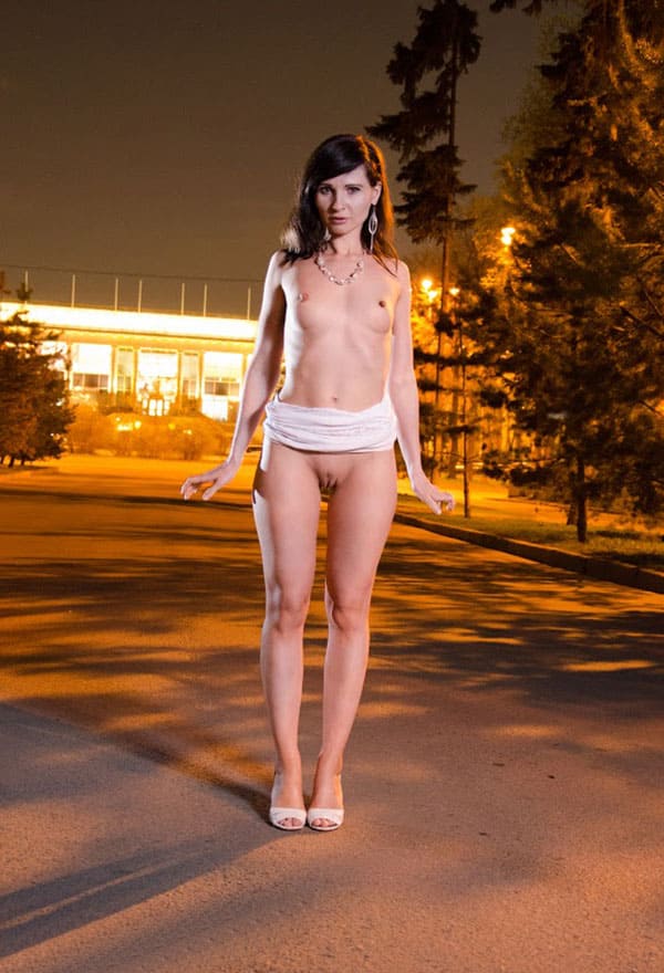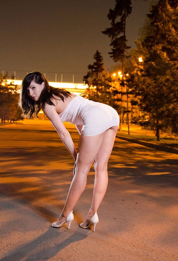 Сочная, красивая женщина гуляет по ночной Москве в коротком белом платье, но она еще не против показать свои красивые части тела, например, попку или грудь, которая кстати выглядет просто шикарно, а еще попозировать без трусов в городском парке на фоне заката.