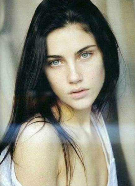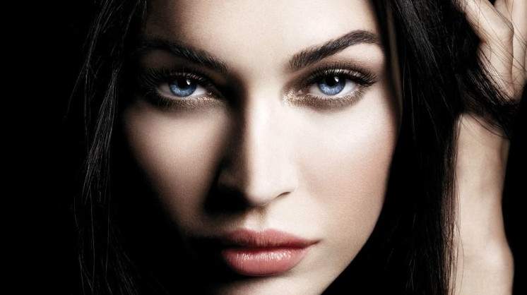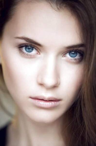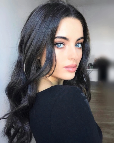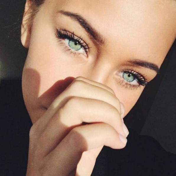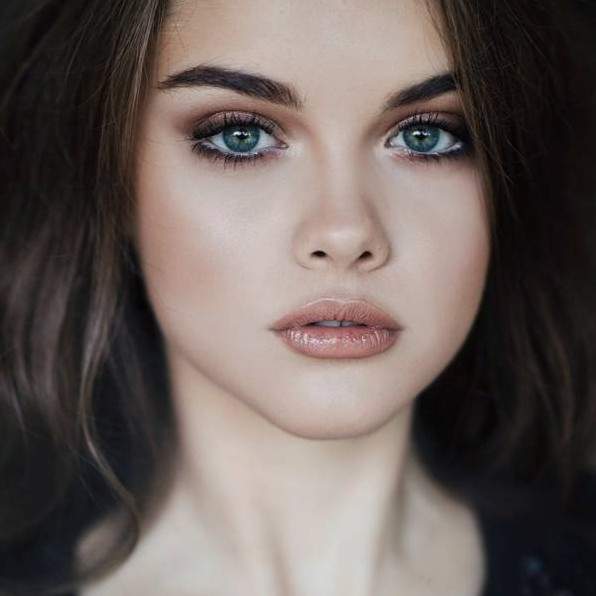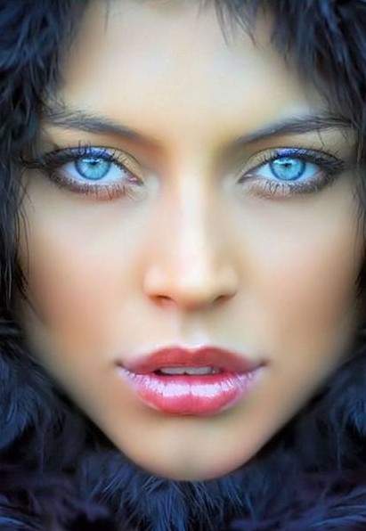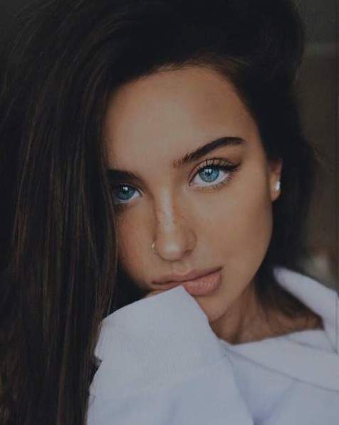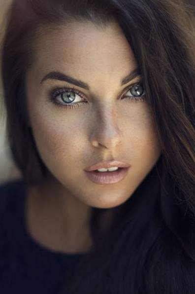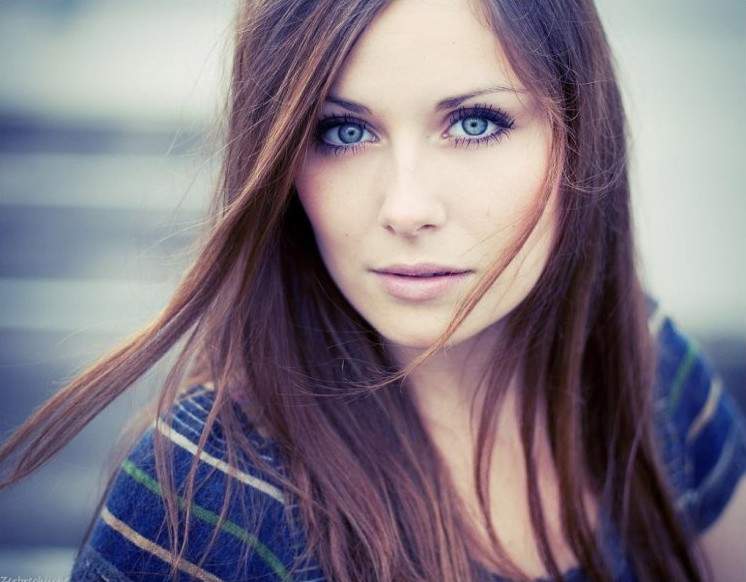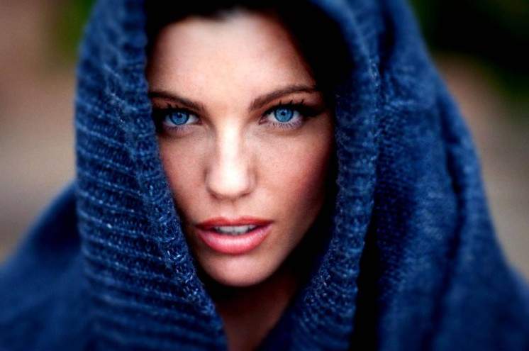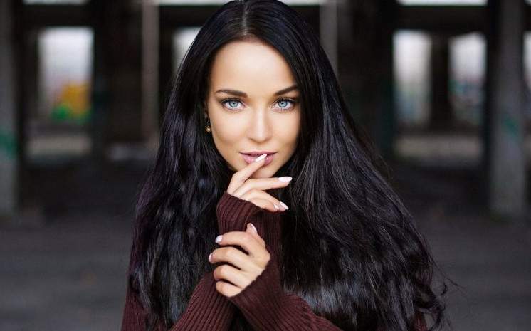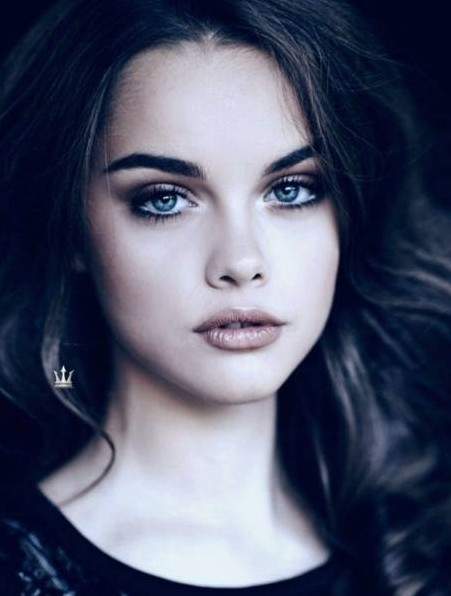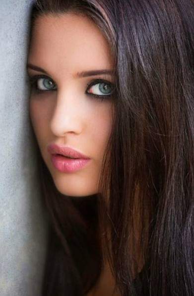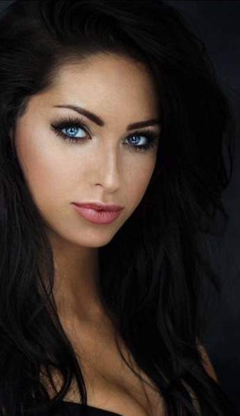 Соблазнительная черноволосая симпатичная женщина с голубыми глазами.