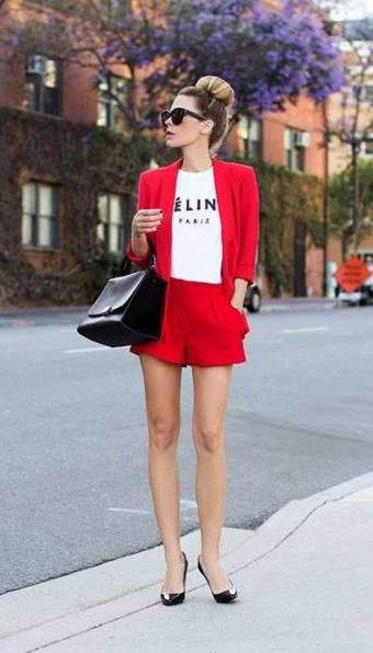 Наряд с красноватыми шортами.