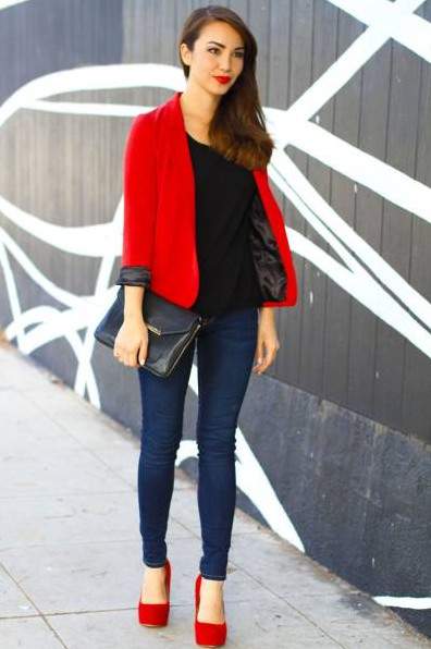 Комбинезон: красный пиджак с джинсами.