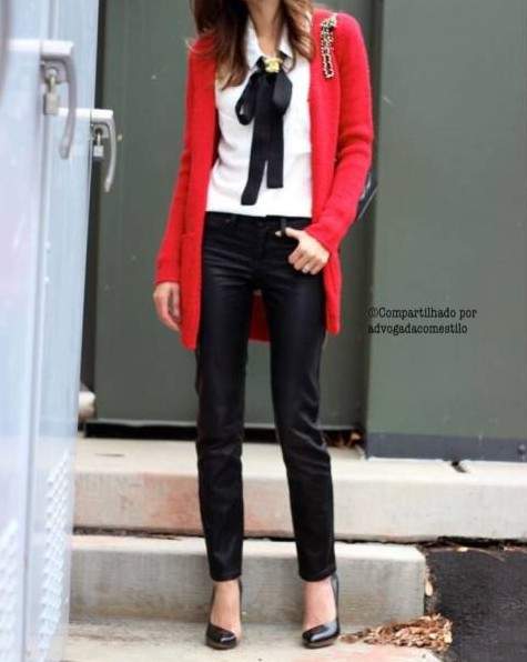 Красный пиджак с кожаными брюками.