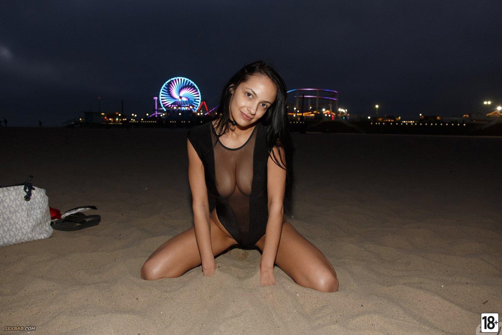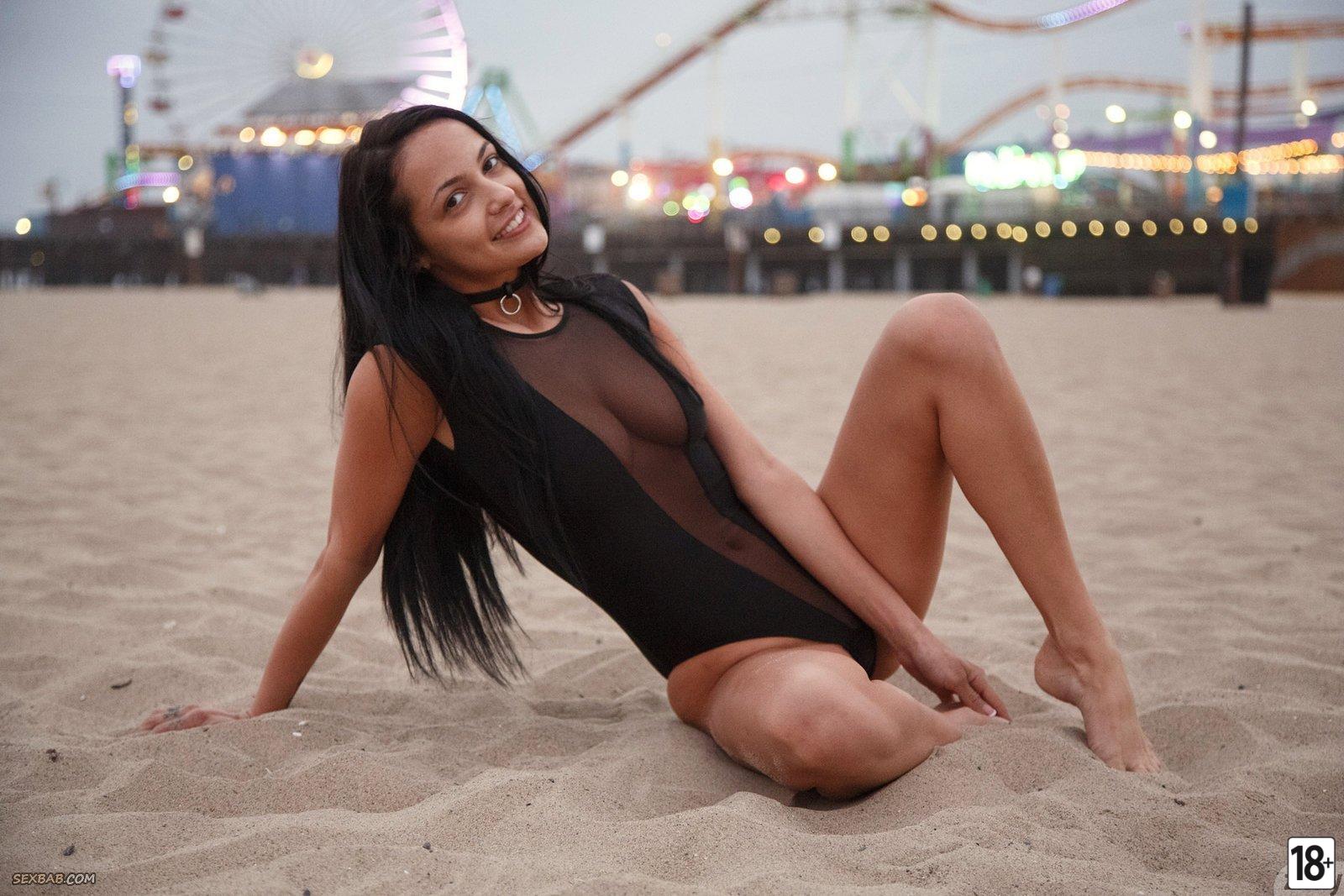 На пляже девушка в черном купальнике позирует эротично в песке, выставляя свои прекрасные формы. Натуральные сиськи иногда мелькают сквозь одежду.…