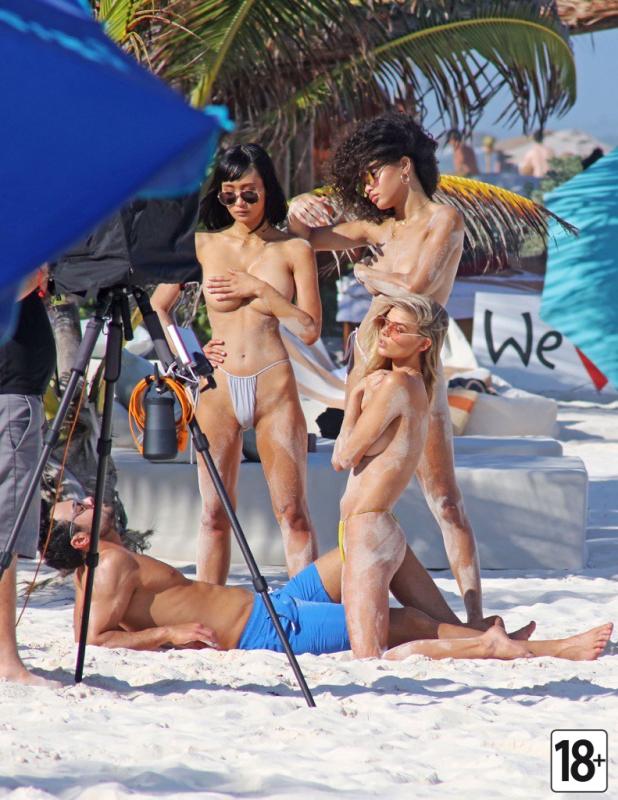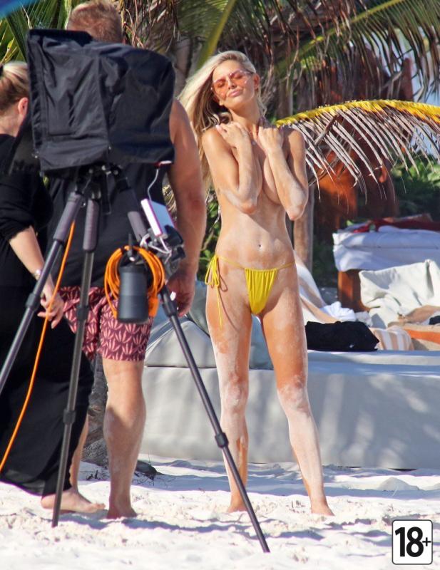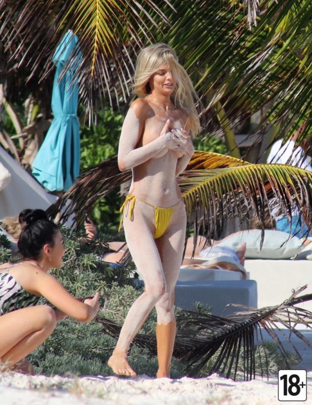 Даниэлль Кнудсон позирует топлес на пляже в Тулуме Мексика
